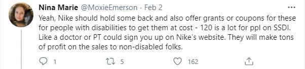 “耐克应该保留一些库存,并为残障人士提供补贴或优惠券,让他们用成本的价格购买——毕竟120美元对需要组织帮扶的残障人士来说还是太贵了。”