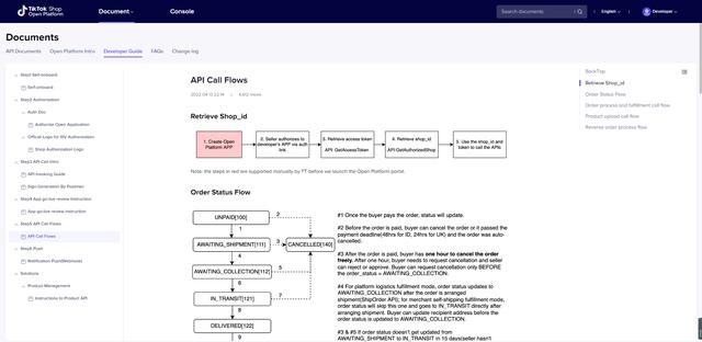 通过tiktok开放平台开发者指南的API调用流程我们看到tiktok订单的状态机,和调用流程(图中API调用流程不是最新版本,在下方的数据交互中作者使用的是最新调用流程)。