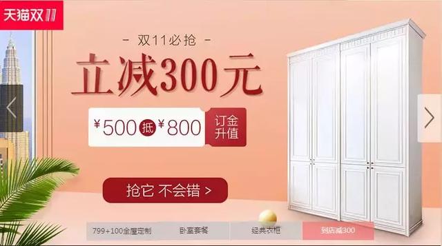 “双十一”前夕,全民狂欢的电商大战已经提前上演。在战火激烈、硝烟四起的家居战场,各个家居企业都拿出了“杀手锏”和看家武器,活动也是独具创意。眼下,天猫、京东等各大平台正在疯狂火拼,花样繁多的预热活动一一登场。下面让我们一起来看看全屋定制家居的血拼“双十一”!
