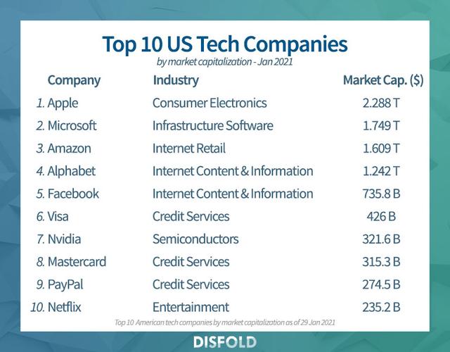 截至2021年1月29日星期五,以下列出的顶级技术公司按美元市值排名。它们主要属于技术领域(主要包括软件和半导体公司),通信服务(例如Internet服务和电信),但也包括一些金融公司(专门从事金融技术)和消费者自由裁量权部门,因为Amazon主要涉足Internet和Direct Marketing Retail行业。