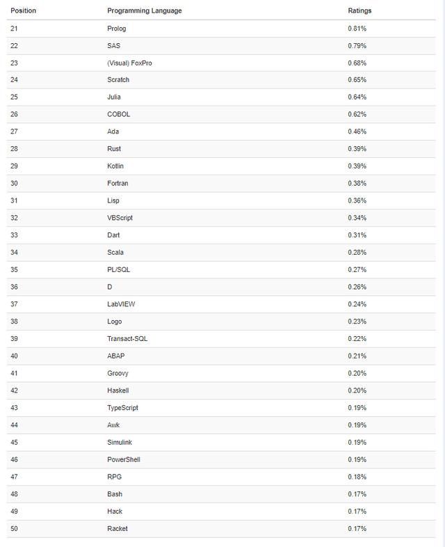 TOP 10 编程语言 TIOBE 指数走势第 51-100 名如下,由于它们之间的数值差异较小,仅以文本形式列出(按字母排序):