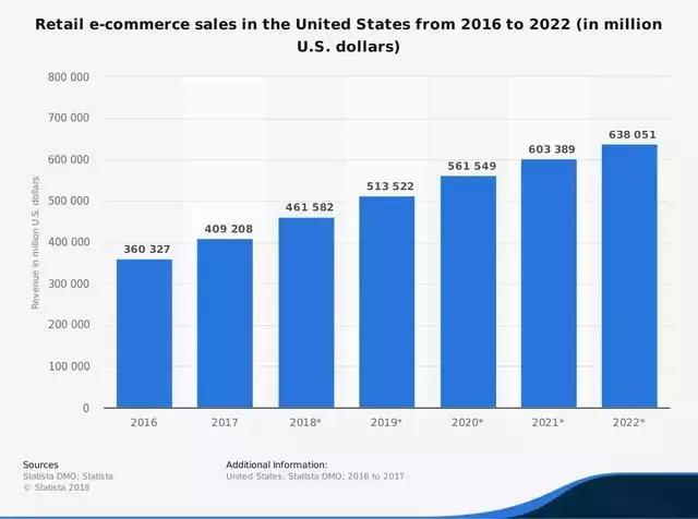 统计机构Statista预计,2022年美国零售电商的销量将接近2016年的两倍。