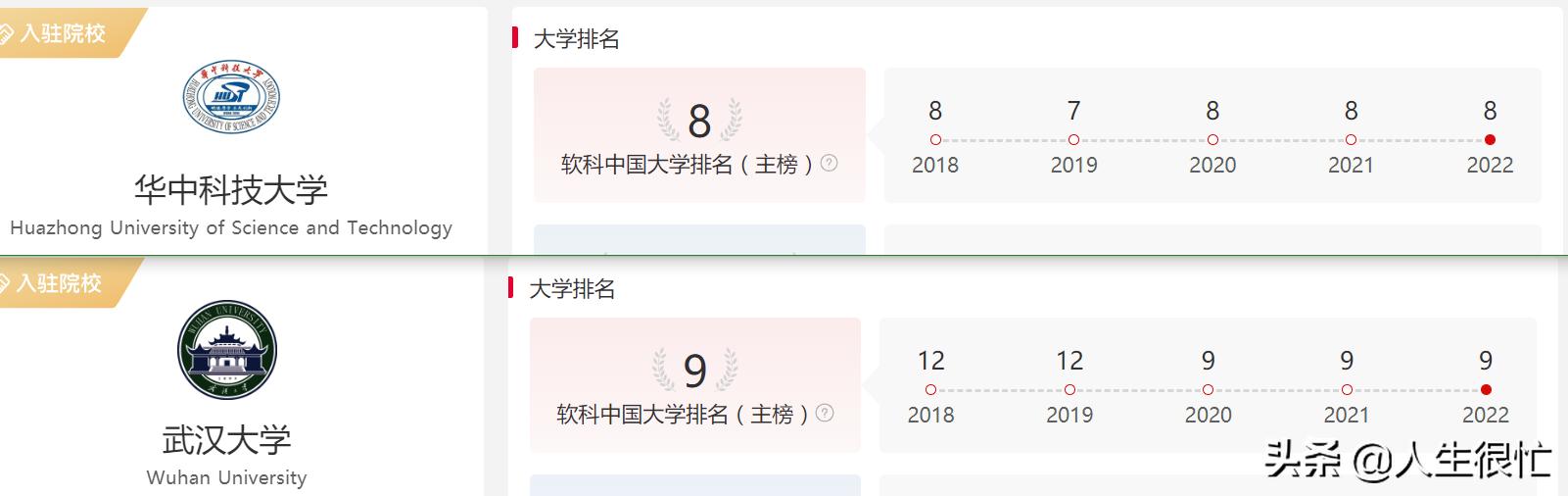 在软科历年排名中,华中科技大学的排名都高于武汉大学;不过,在近三年的排名中,华中科技大学的排名比武汉大学高出1名。