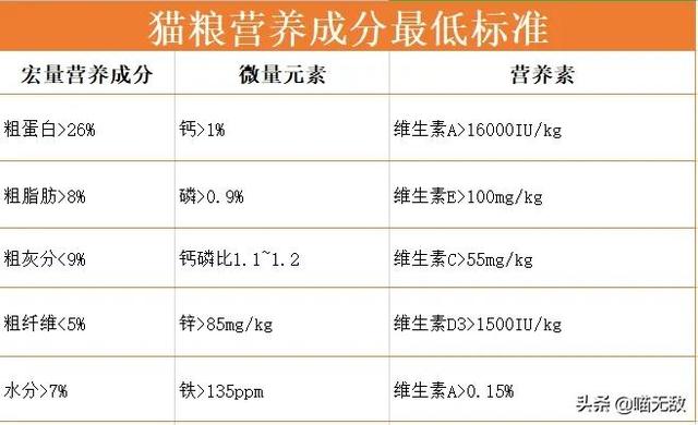 但凡一款合格的商品猫粮,是必然能在外包装上找到营养成分表的,这不仅是饲料行业的标准,也是对消费者负责的一种态度。那么到底要怎么去读营养成分表呢?各种名称,各种数据,它们认识我但我不认识它们?怎么办?别着急,这里给大家一个表格来参考,是一些关键成分的最低标准!是最低标准!但凡某一款猫粮有一项不符合的,建议直接pass.
