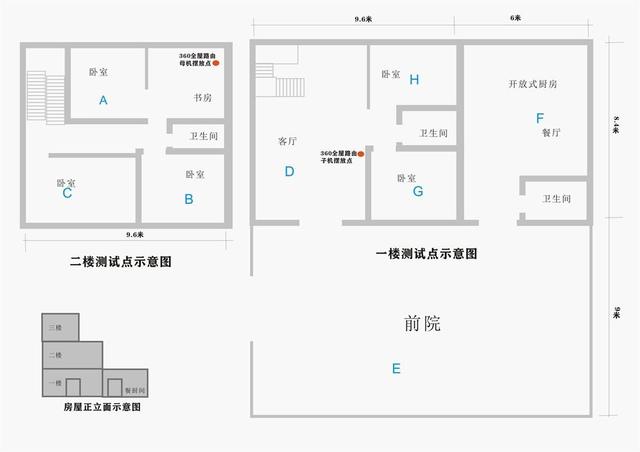 此次参与测试的房子是栋小二层半私房。一楼套内面积约131平,二楼套内面积约80平,三楼有两室堆放了杂物没住人(平时基本不上去,所以就没测了),另一楼前院面积约140平左右。参与测试的360全屋路由母路由放在二楼书房A点斗柜上(宽带就接在这,正好把路由放在这,能更好检测它的覆盖面有多大)。子路由放在一楼客厅小边柜上。