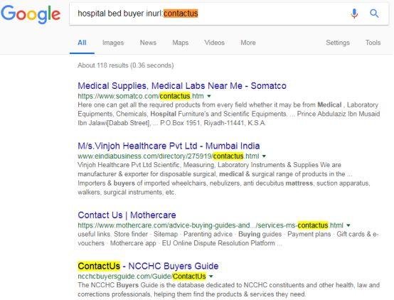只要搜索“hospital bed buyer inurl:contactus“,就可以一次性搜出护理床买家的公司官网联系页面: